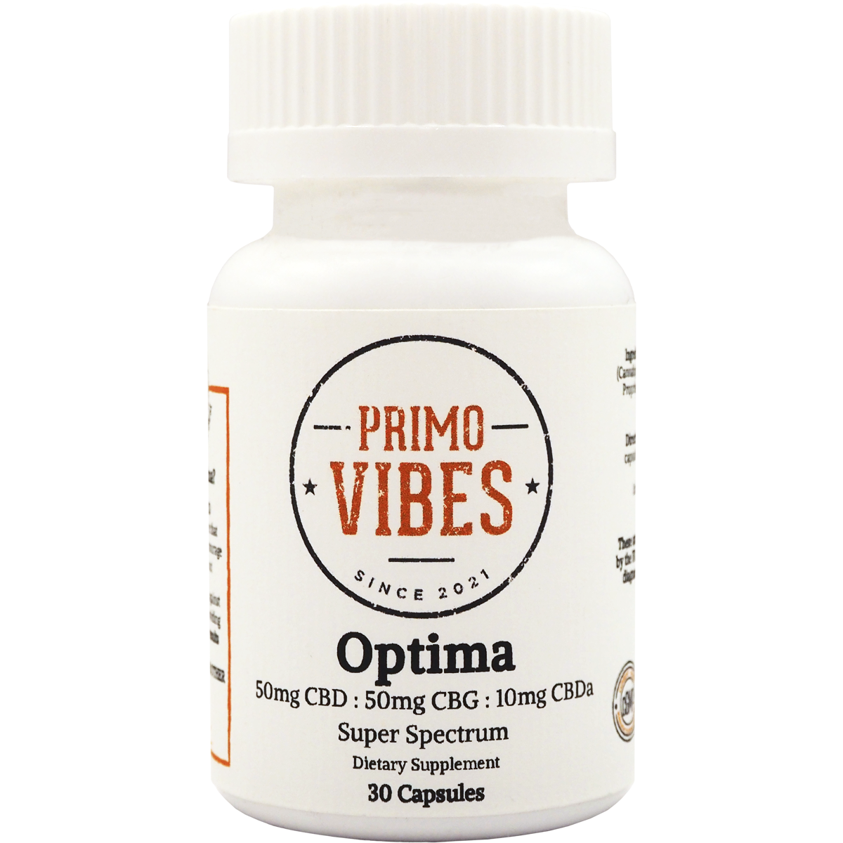 Discover the Power of The Entourage Effect with Optima Super Spectrum Capsules from Primo Vibes! Optima marks an exciting new chapter for Hemp-derived Alternative Health and Wellness Products, presenting a unique and easy-to-use way to get your daily dose of mind and body supporting Cannabinoids, featuring 50mg each of CBD and CBG, along with 10mg of CBDa to promote physical and mental wellness naturally.